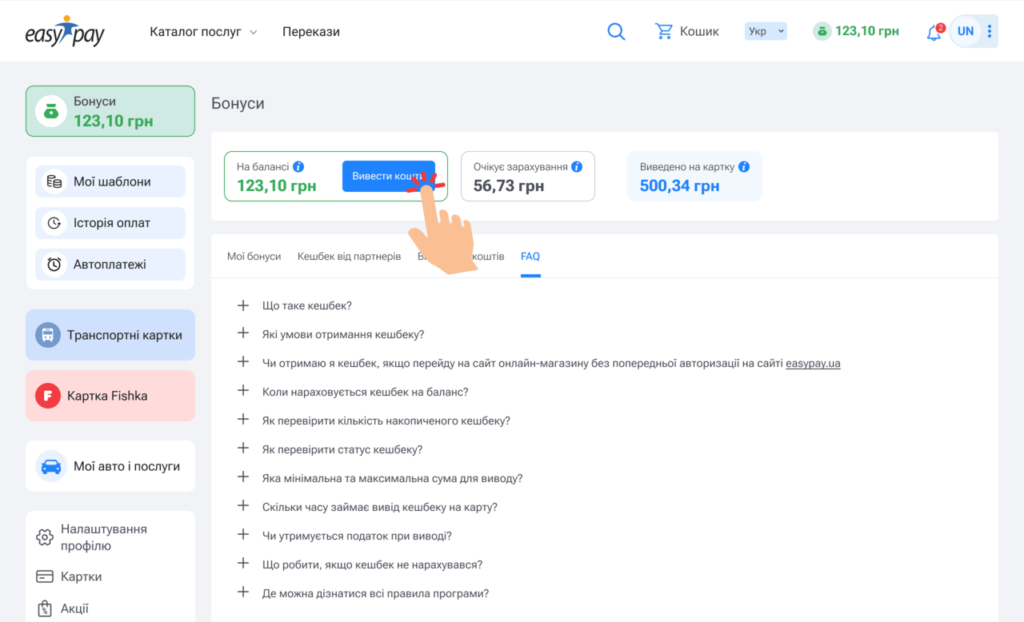 Все накопленные бонусы отображаются в новом разделе «Бонусы» в Личном кабинете на сайте и в приложении EasyPay. Тут доступны:
